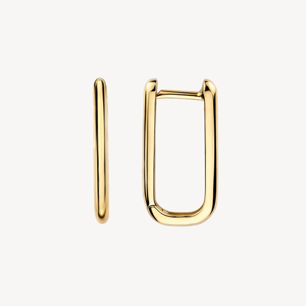 These 14k yellow gold earrings with a modern and minimalist rectangular design are real eye-catchers. The width is 7.3 mm and the length 15.2 mm. Wear these earrings on their own or combine them with other pieces of (ear) jewellery from our collection.
