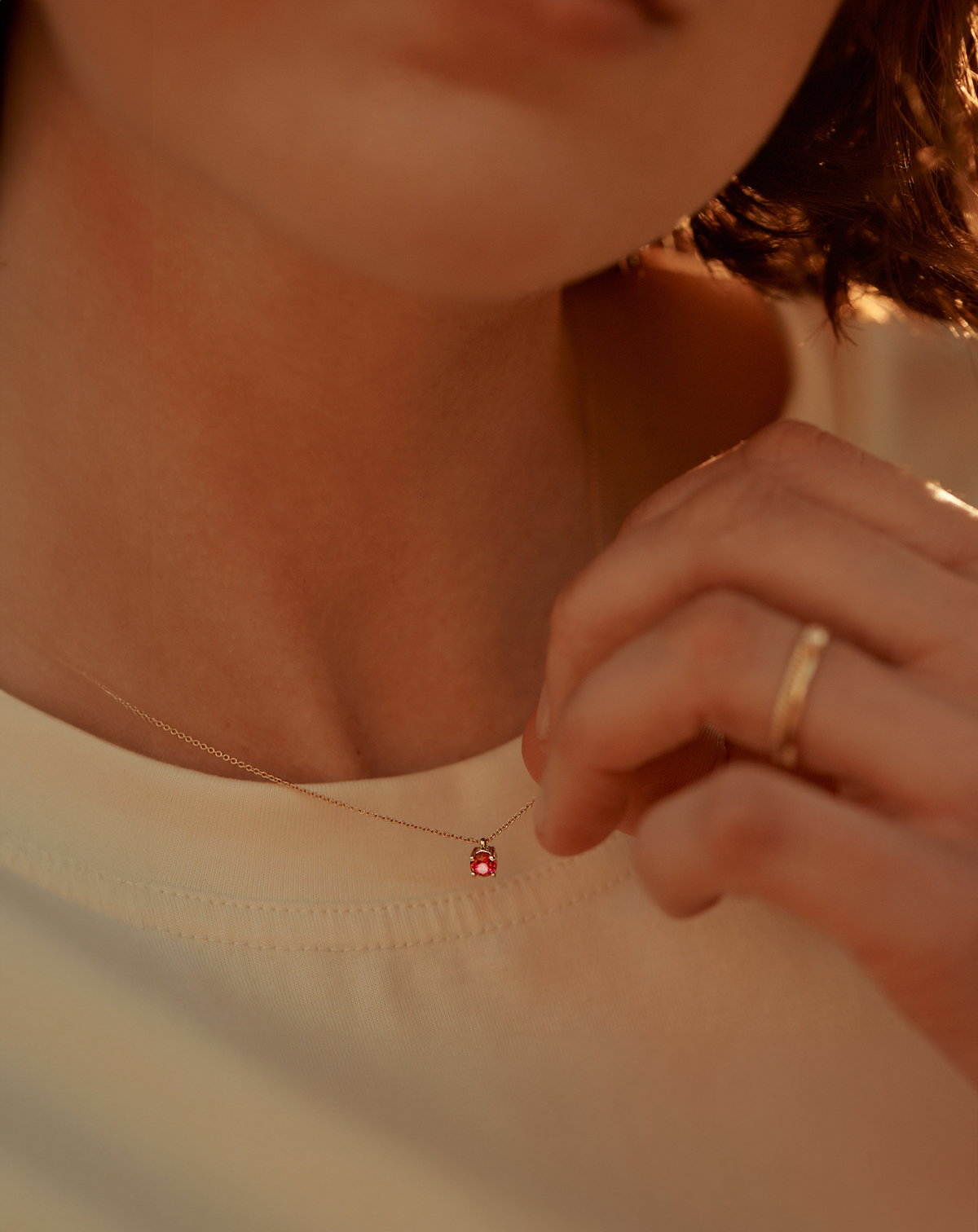 Een sieraad met een geboortesteen is een heel persoonlijk cadeau, voor een ander of jezelf. In dit 14k gouden collier schittert een rode robijn, de steen die hoort bij de maand juli. Robijn staat voor kracht en doorzettingsvermogen, maar ook voor het talent de rust te bewaren.